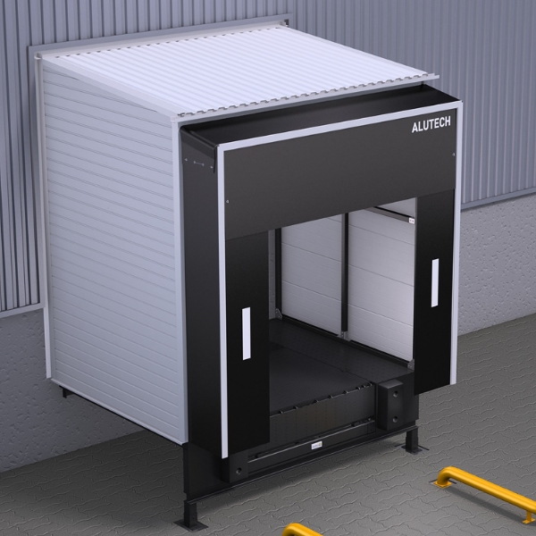 Главная / Перегрузочное оборудование / Перегрузочные тамбуры / Перегрузочный тамбур Alutech DH (45 градусов, заполнение сэндвич-панель)